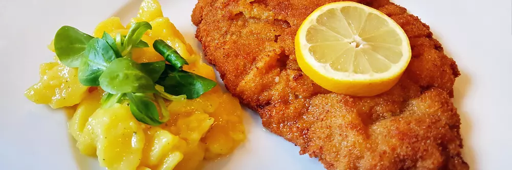 Paniertes Schweineschnitzel mit Champignon-Rahmsauce, dazu Kartoffelecken